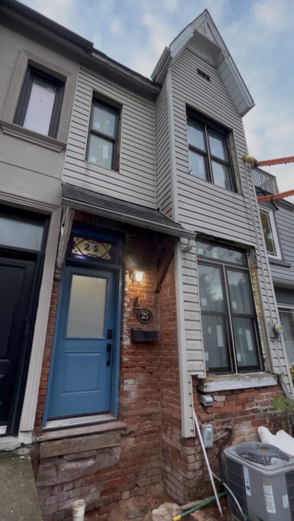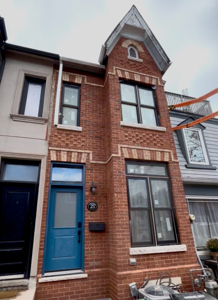 This project involved the full restoration of a late 19th-century brick façade in the King West area of Toronto. When work began, scaffolding was installed and the exterior siding was removed to expose the original brickwork. Once uncovered, it became clear that the masonry was in extremely poor condition—the siding itself was effectively the only thing preventing the façade from collapsing.