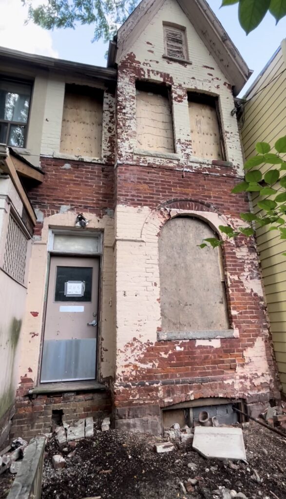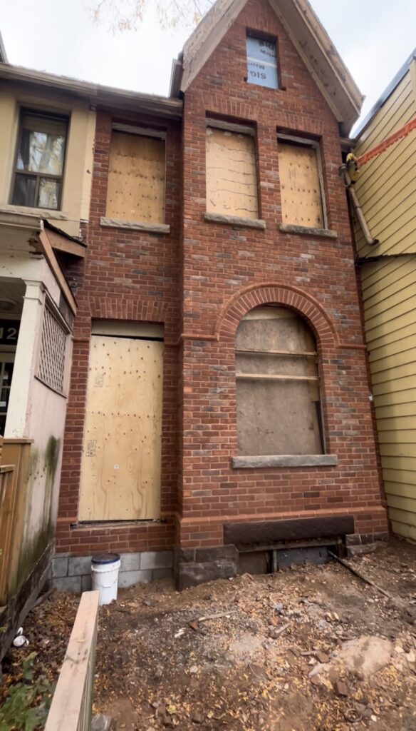 We recently completed the full rebuilding of this Victorian brick façade in the South Riverdale Neighbourhood of Toronto. The project began with the installation of scaffolding and the careful dismantling of the existing wall, brick by brick.