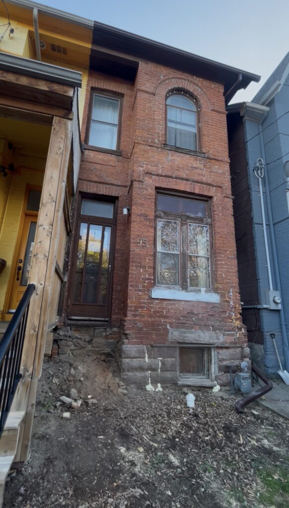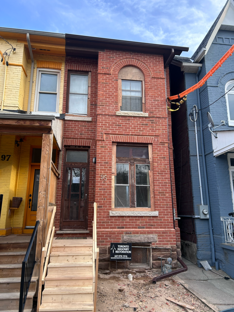 This project involved the full dismantling and rebuilding of a Victorian-era façade in the Palmerston–Little Italy area of Toronto. The original masonry had deteriorated significantly over time. The stone foundation had subsided and shifted, and the brick had previously been aggressively sandblasted in an attempt to remove paint, which severely weakened the outer face of the brickwork.
